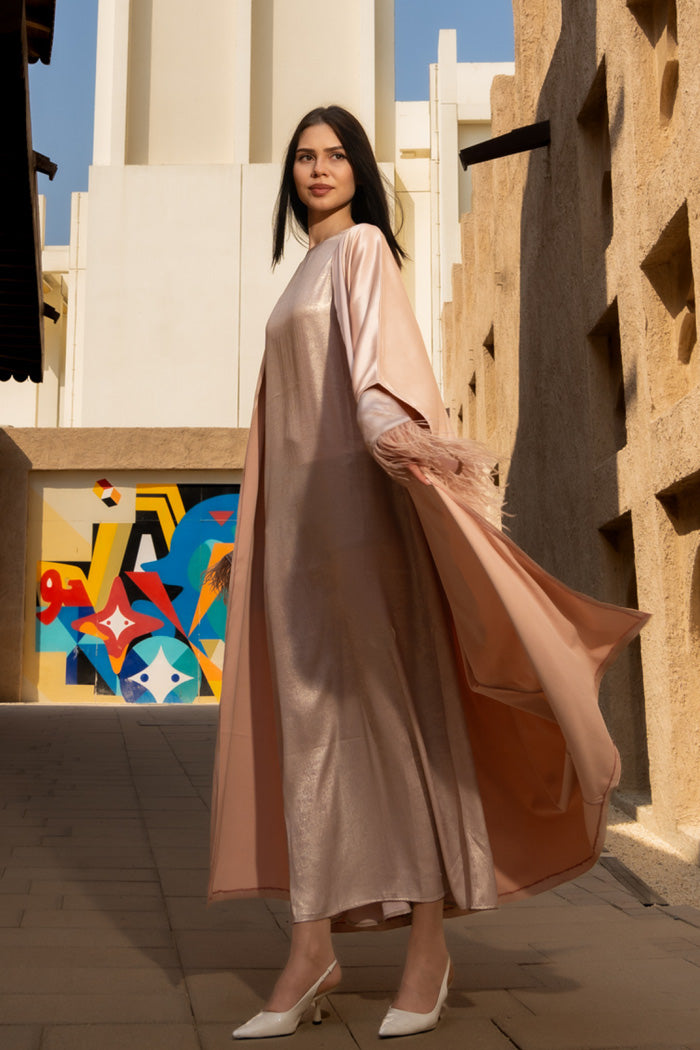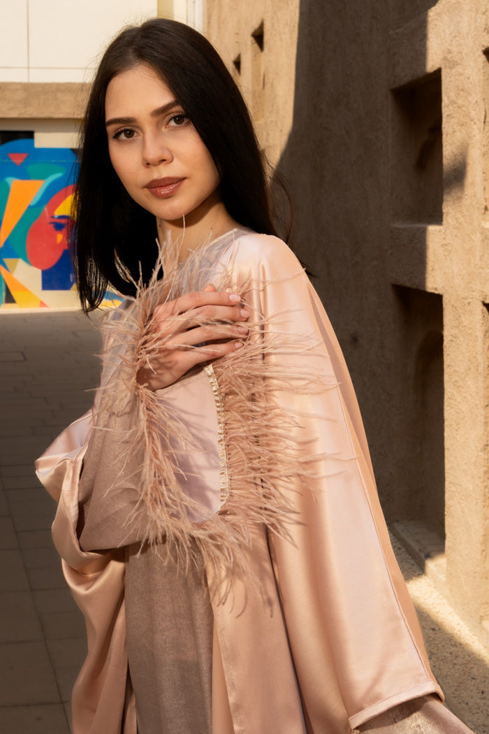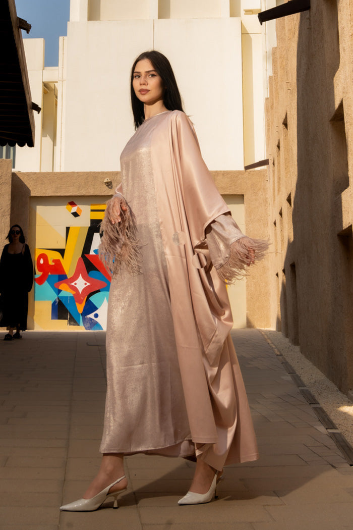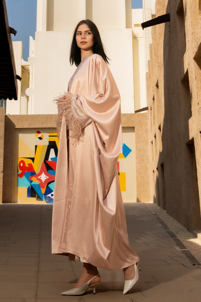 Drift into dreamy elegance with the Aurora Drift Abaya, an airy creation designed for women who embrace soft femininity. Made from premium Russian satin in a delicate pink hue, this open-style abaya features graceful batwing sleeves, allowing effortless flow and movement.
